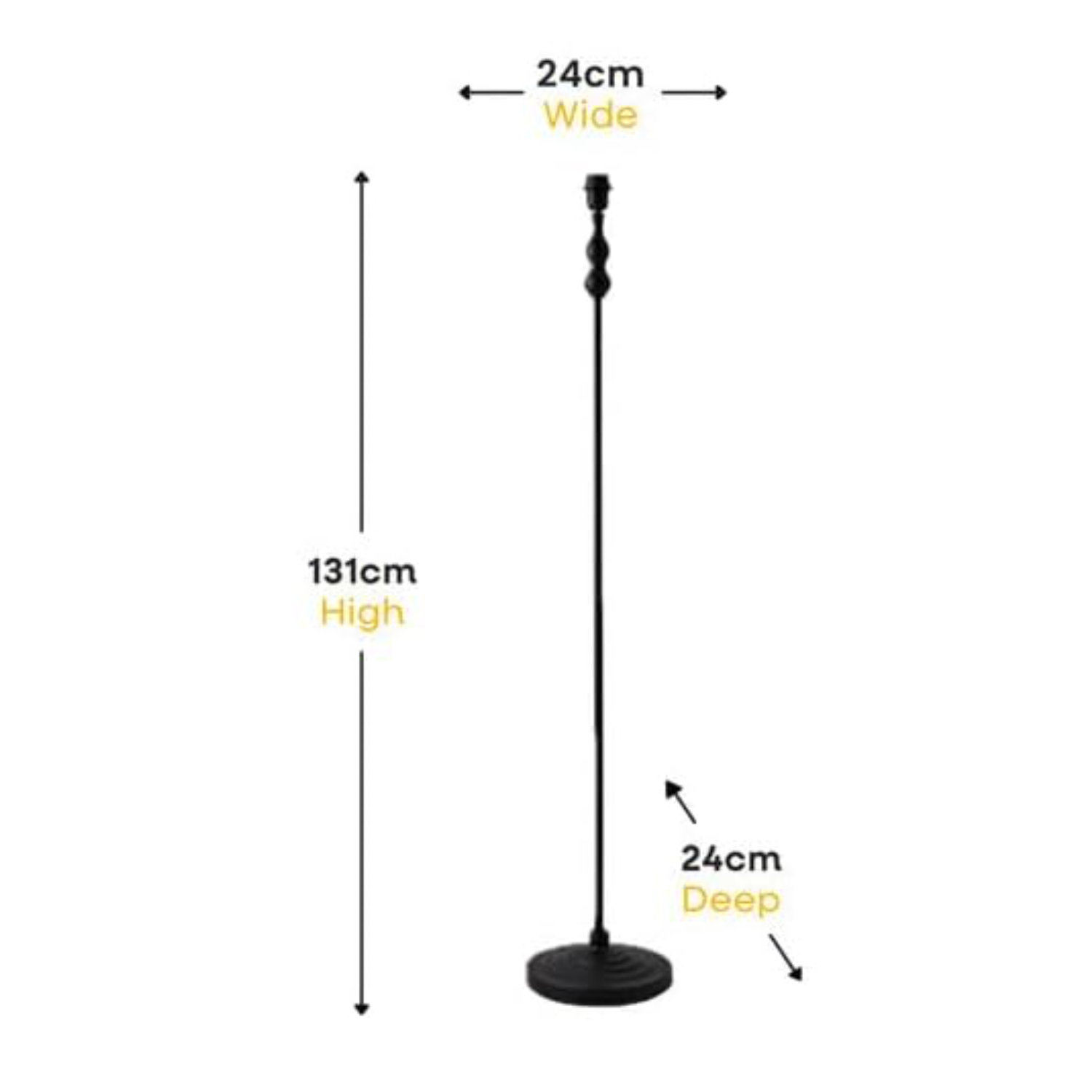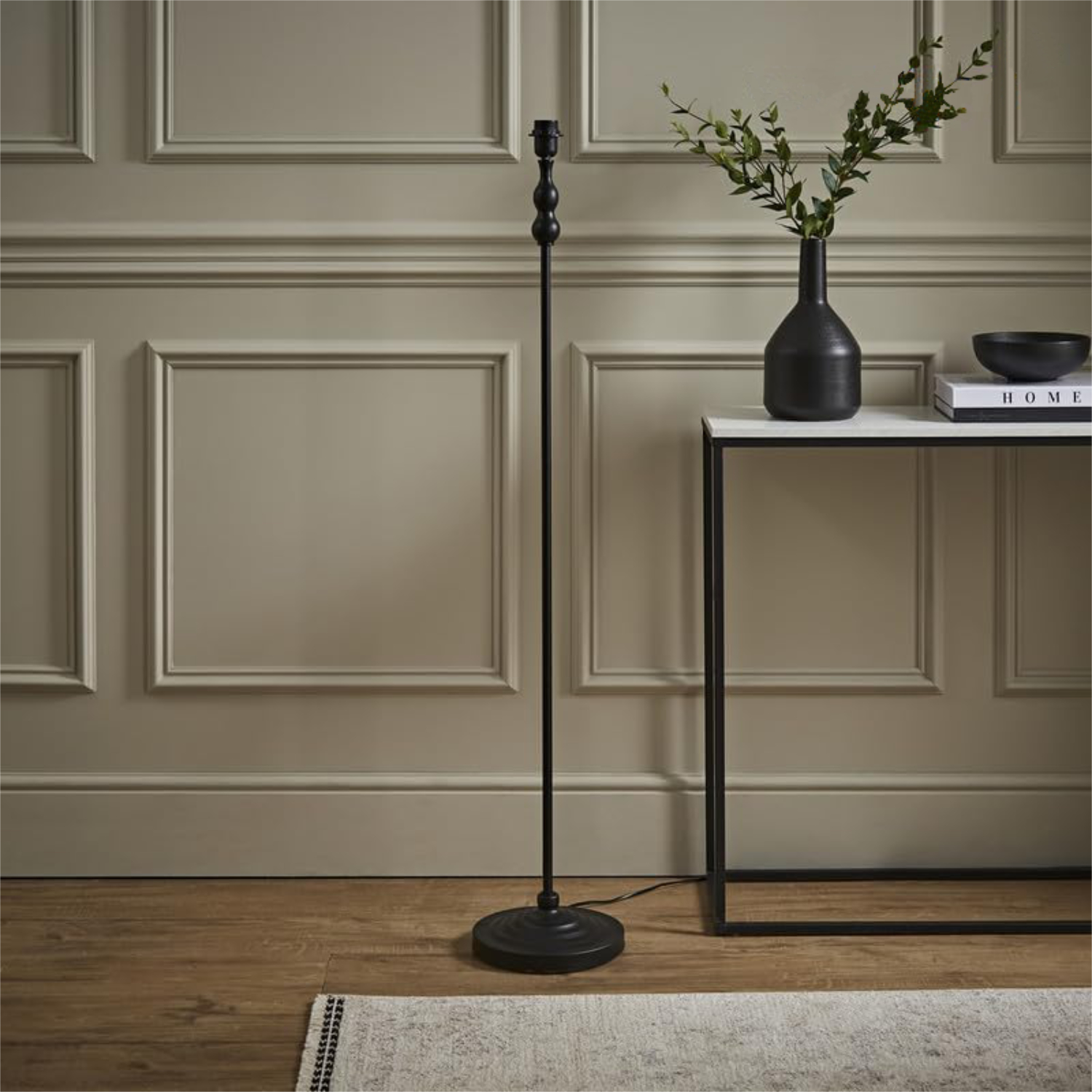 A black metal candlestick floor lamp with a slim stem and wide base. Designed to pair with a variety of lampshades and ideal for filling empty corners in the home.
