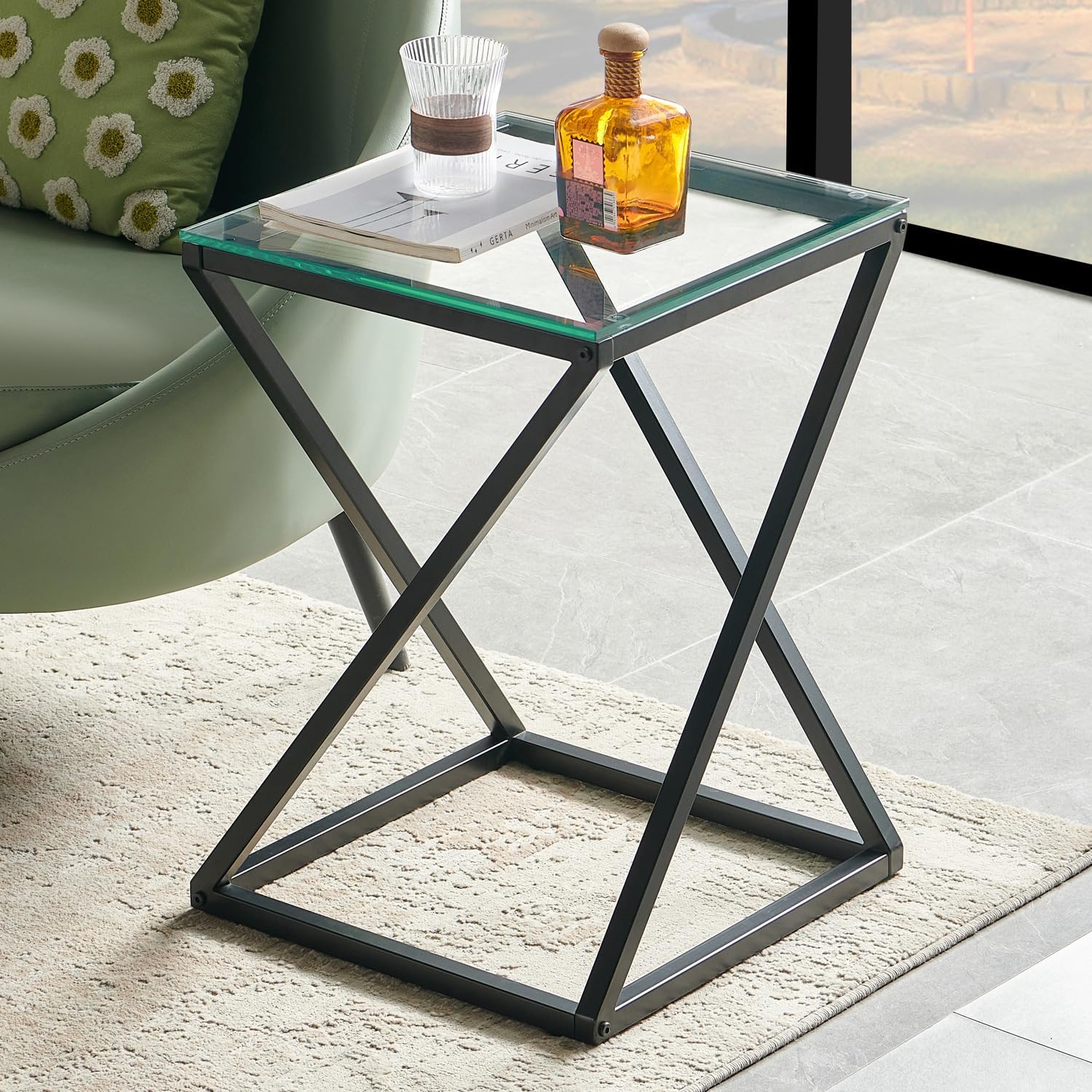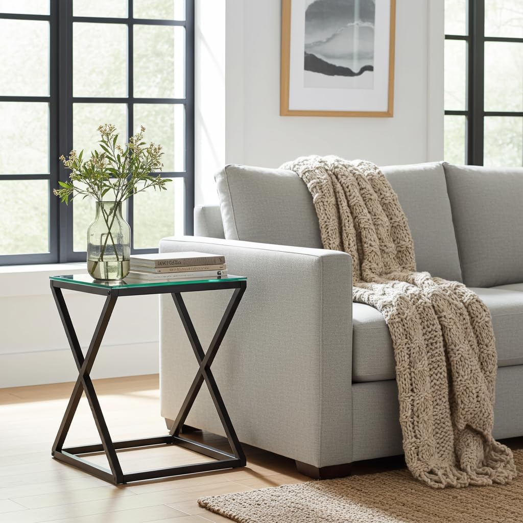 A contemporary side table featuring a distinctive twist-shaped black metal frame and a clear toughened glass top. Compact and practical, it’s ideal beside a sofa, armchair or bed, offering a sleek surface for lighting and everyday essentials.